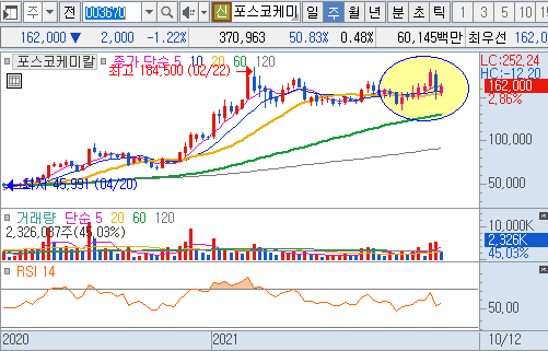 - 포스코케미칼은 포스코 그룹과 함께 리튬·니켈·흑연 등을 확보하고 배터리 리사이클링 사업에도 진출해 원료부터 소재 생산까지의 밸류체인을 완성하고 있어 관련주로 분류되고 있습니다.