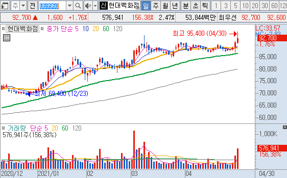 - 현대백화점의 실적은 2020년 12월 전년동기 대비 매출액은 3.4% 증가하였으며, 영업이익은 53.5% 감소하였음.